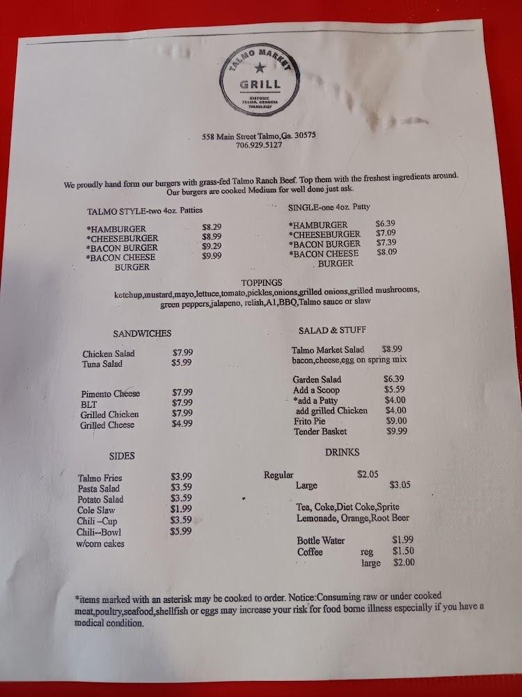 Welcome to Talmo Market Grill, your go-to American restaurant in Talmo, GA, where culinary passion meets comfort. Nestled at 558 Main St, we serve a delightful range of breakfast, lunch, and dinner options, all expertly prepared with local specialties. Our cozy and historic ambiance makes it perfect for solo diners, families, or groups, and our accessible facilities ensure everyone is welcome. Enjoy quick service, hearty meals, and delectable desserts at prices ranging from $10 to $20. Plus, we offer takeout, delivery, and dine-in options. Come savor our excellent coffee and taste the heart of Talmo at Talmo Market Grill!